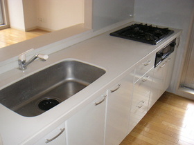 カウンターキッチンでLDK12.6帖とと大変広く開放感のある陽の当たるリビングです。