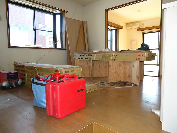 写真のいたるところに工具や木材が散らばっております